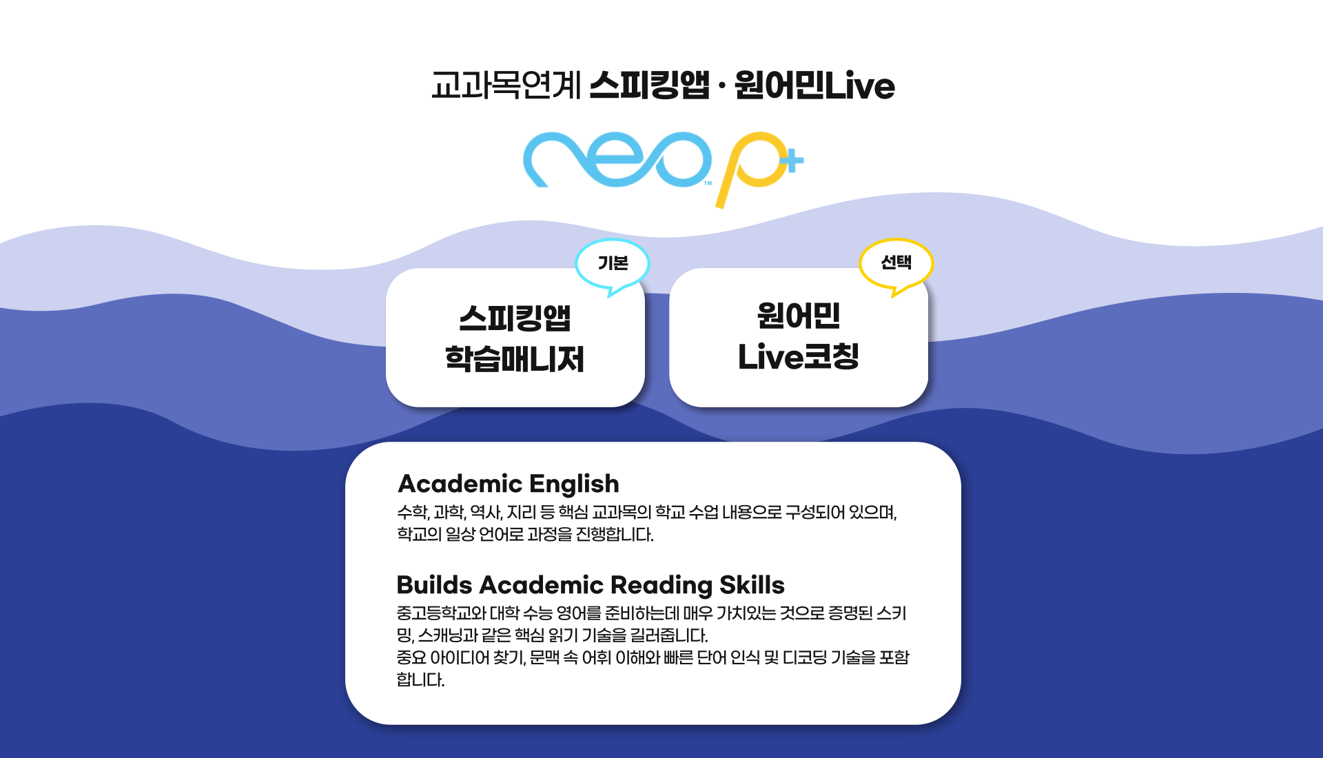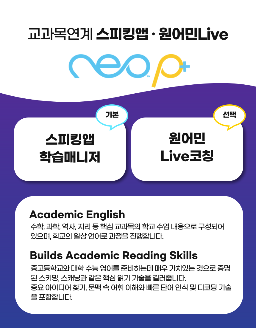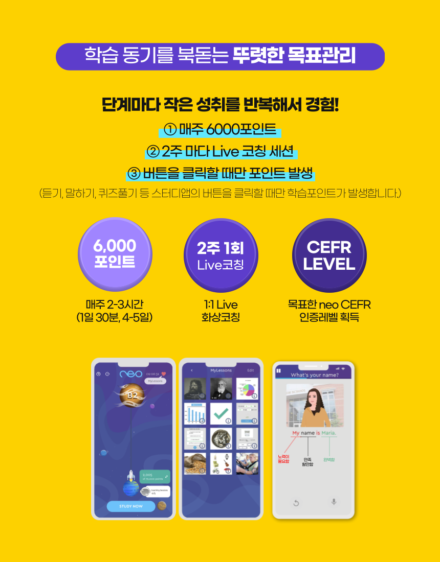 스터디앱으로 연습한 내용을 neo Live를 통해서 인증 코치와 1:1 활용하며 영어 의사소통 기술을 개발합니다.
