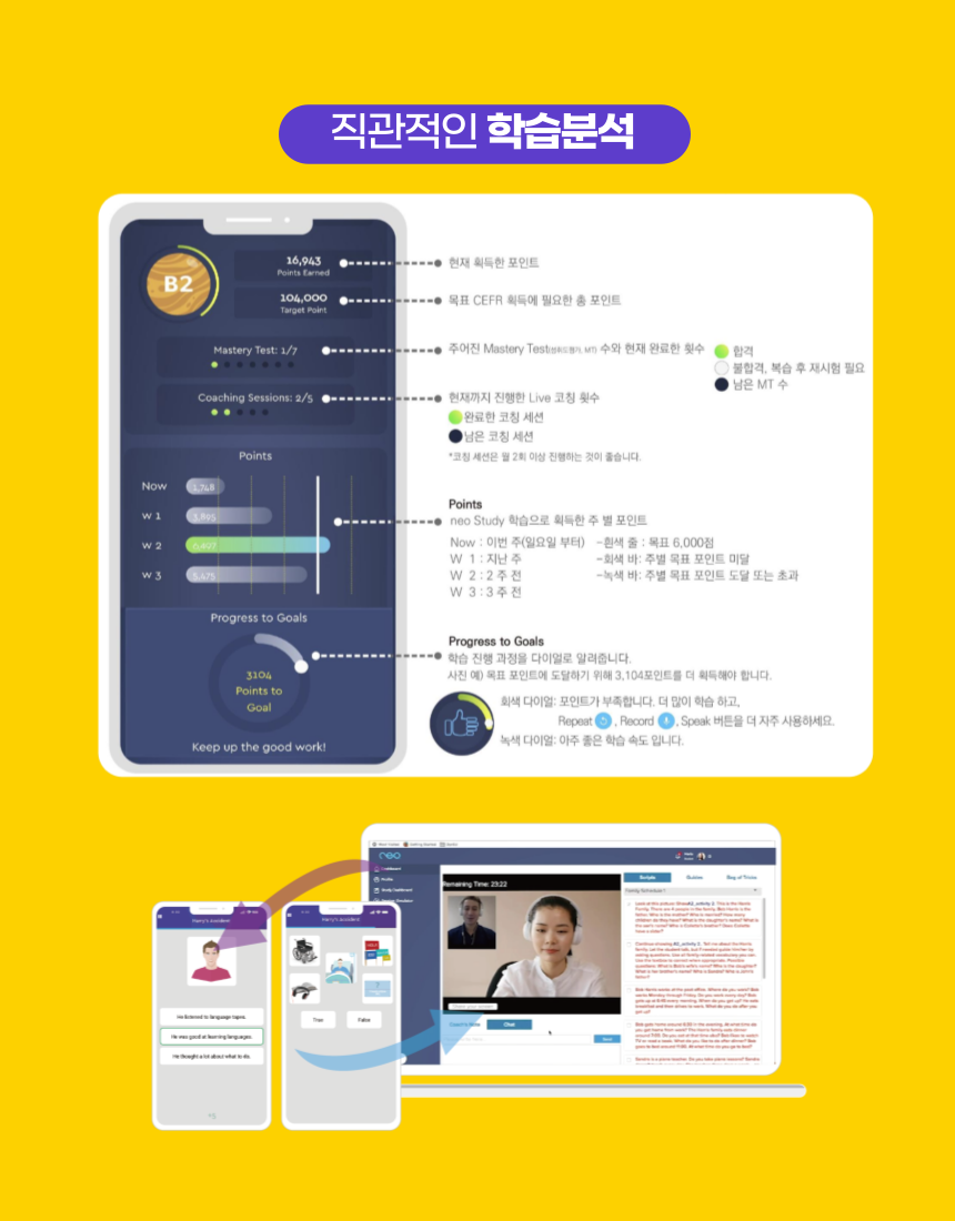 neo Study App을 통한 연습만으로는 부족할 수 있습니다. App으로 연습한 내용을 인증 Speaking 코치와 Live로 활용해 보며, 대화 스킬을 늘릴 수 있습니다. neo의 뛰어난 인공지능(AI) 기술은 학습자들의 학습 결과는 물론 각 학습자들이 겪고 있는 어려움을 분석하여 코치에게 실시간 제공합니다. 한 단계 더 높은 과정으로 발전하기 위해 필요한 내용을 완벽하게 알려줍니다.
